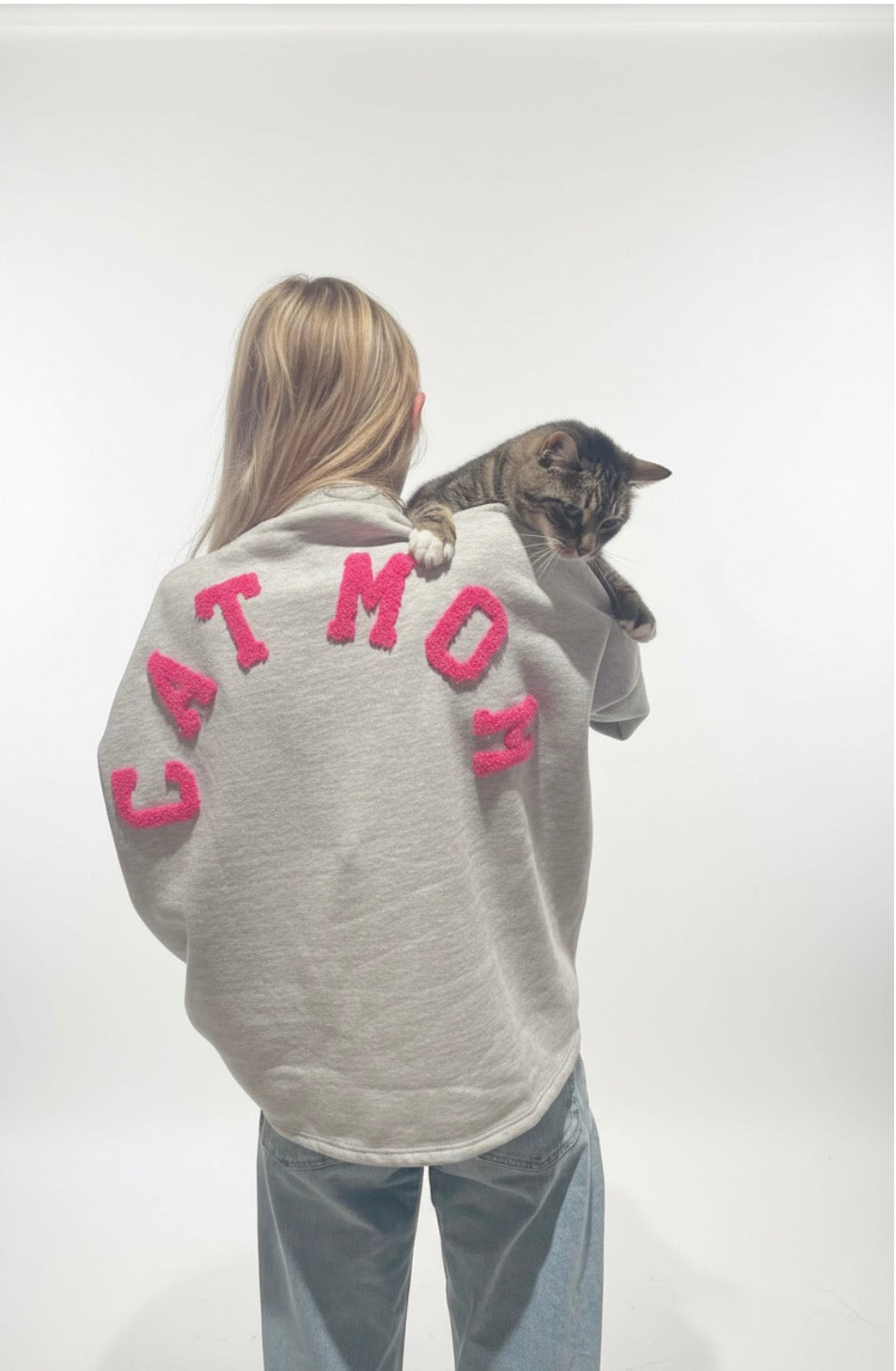 Deze luxe oversized sweatshirt in premium grijs melange is perfect voor elke kattenliefhebber. Het geborduurd CATMOM-logo op de rug met fluffy roze letters maakt dit een echte statement piece.