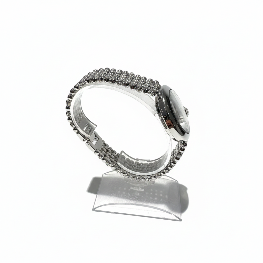 Elegant horloge met armband. Dit prachtige timepiece combineert tijdloze stijl met luxe afwerking. De volledig met kristallen bezette armband geeft een schitterende uitstraling, perfect voor elke gelegenheid.